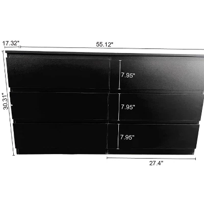 - Spacious Storage Space:The overall size of this dresser is 55.1 “L * 17.3 ” W * 30.3 ” H, and there are 6 large drawers, each with a depth of 13.7 inches, providing enough storage space for clothes, baby diapers, decorations, etc. The solid top of this black dresser can be used as a TV cabinet, which is perfect for displaying photos, bouquets, potted plants, lamps, candlesticks, vases and abstract decorations.