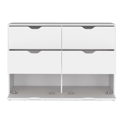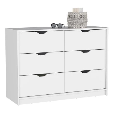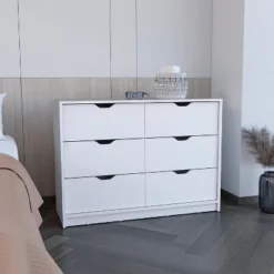 - Unique Design Style:This 6-compartment drawer cabinet showcases a simple and modern design,injecting warmth and comfort into the family environment.The white cabinet body combined with free handles not only amplifies the modern touch of the home environment but also offers enhanced convenience during use.Moreover,the smooth wooden tabletop provides an ideal place for your jewelry and ornaments.