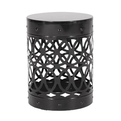 This side table highlights modern minimalist lines and iron hollow design, with a cylindrical structure and overlapping circular cutting patterns. The powder-coated process enhances durability.